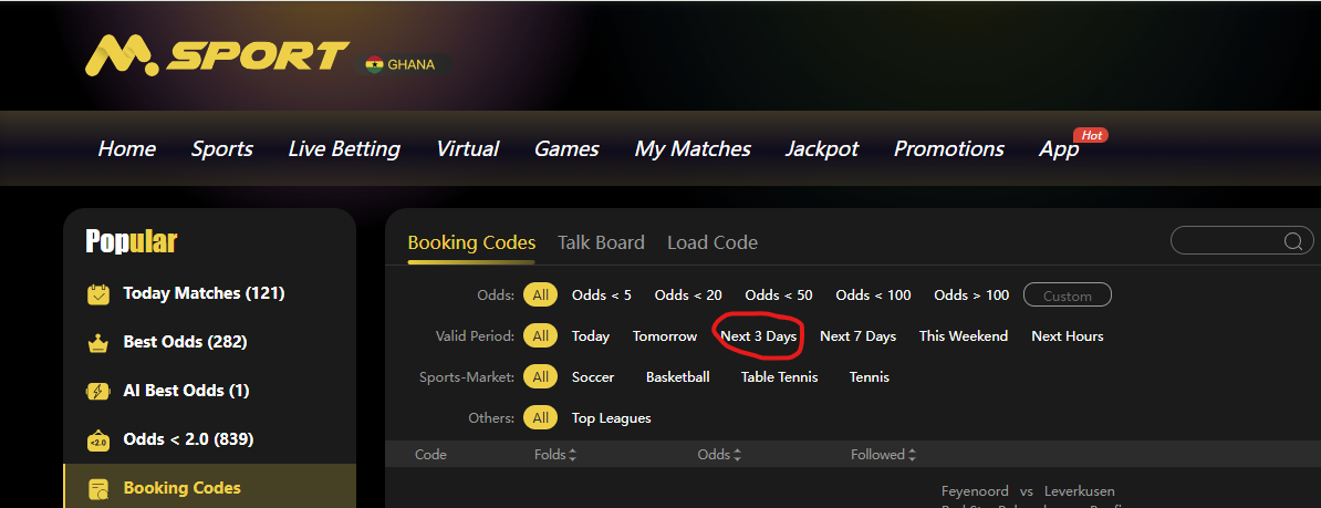This is the process on how to get booking code on the Msport site for games within the next 3 days
