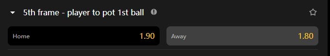 5th frame - Player to pot 1st ball (Snookers) Ayodeji Bamidele December 21, 2024 15:23 Updated "5th frame - Player to pot 1st ball" refers to identifying which player pots the first ball during the 5th frame of a match. Related to Snooker Comments 0 comments Article is closed for comments.