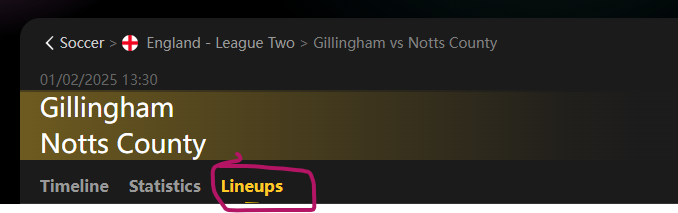 6. Click on Lineup to check lineup for both home and away team.