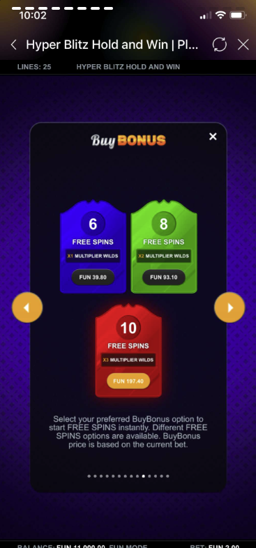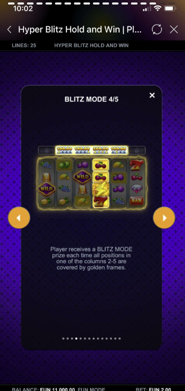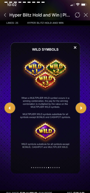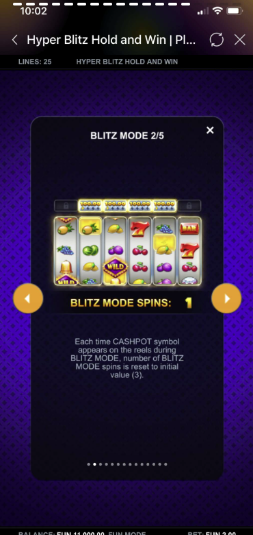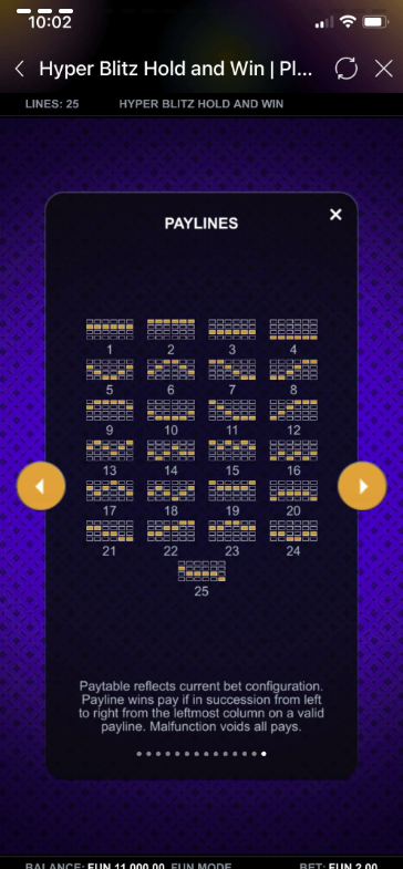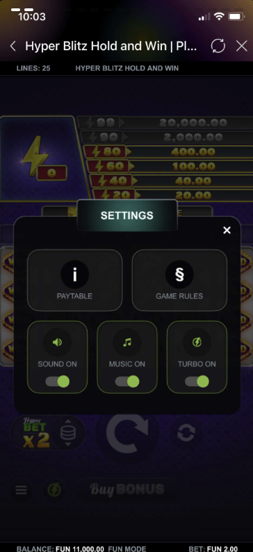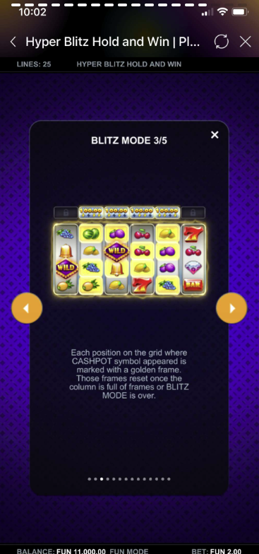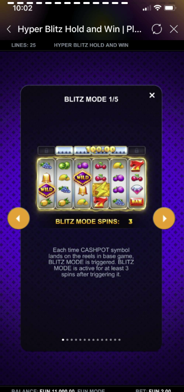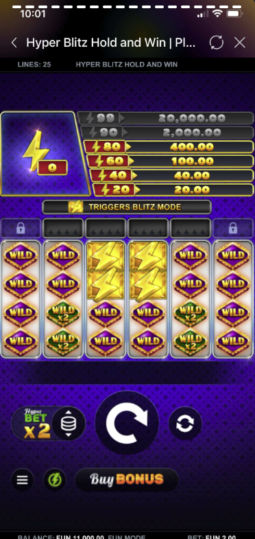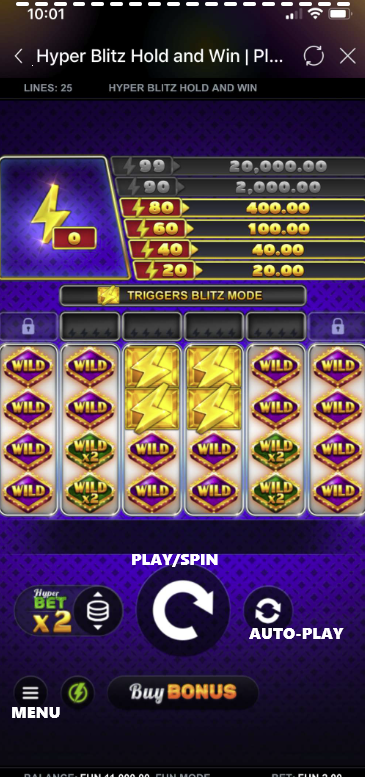 Hyper Blitz Hold and Win is a dynamic 6-reel, 4-row slot game with 25 fixed paylines. It includes exciting features such as Blitz Mode, Cashpots, HyperBet levels, Free Spins, and Multiplier Wilds. Players always play with all paylines active, ensuring maximum win potential each spin.