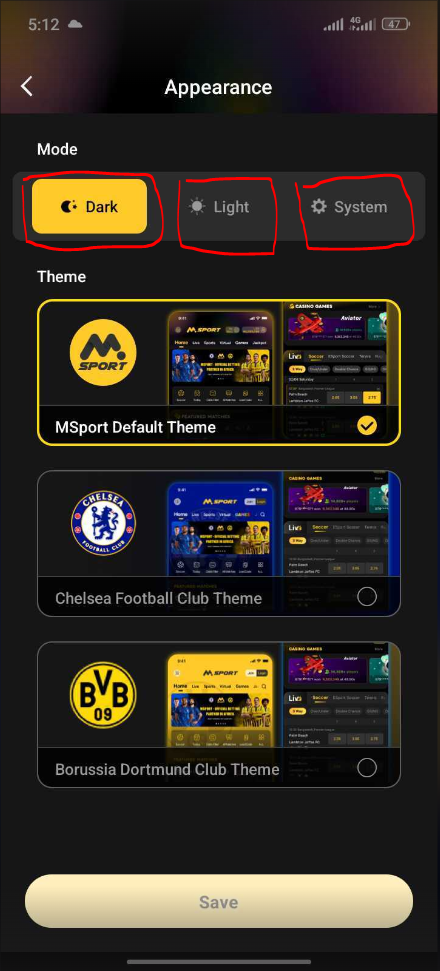 5. Dark mode consist of Msport default theme, Chelsea default theme and Borussia Dortmund club theme on dark appearance.