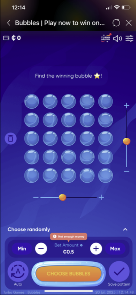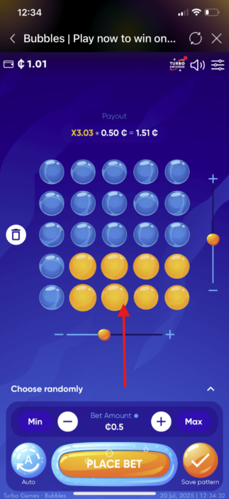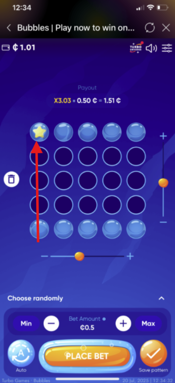 Click the "Place Bet" button to pop the bubbles. If you find the bubble with the star, you win!