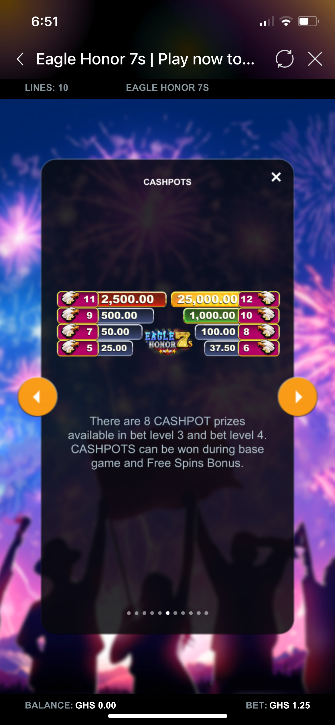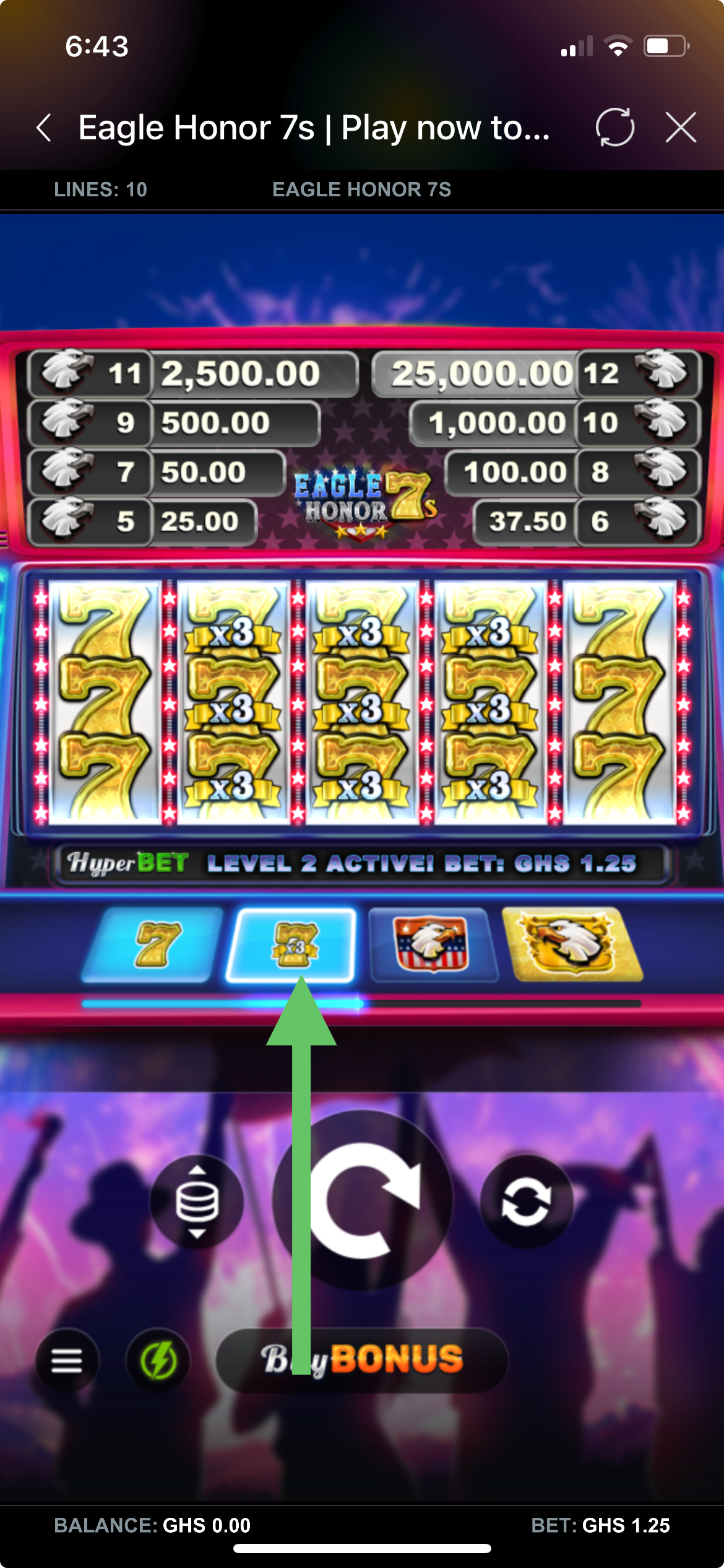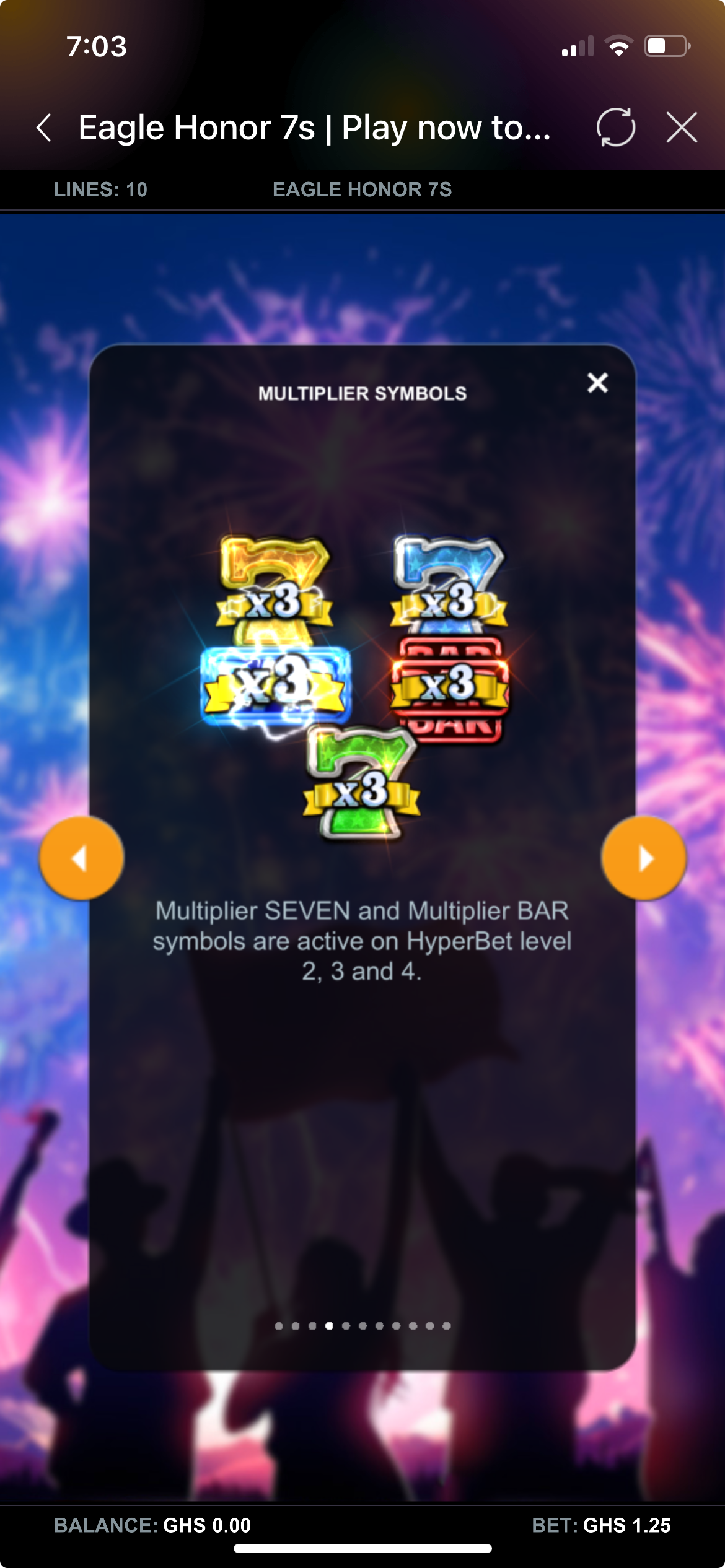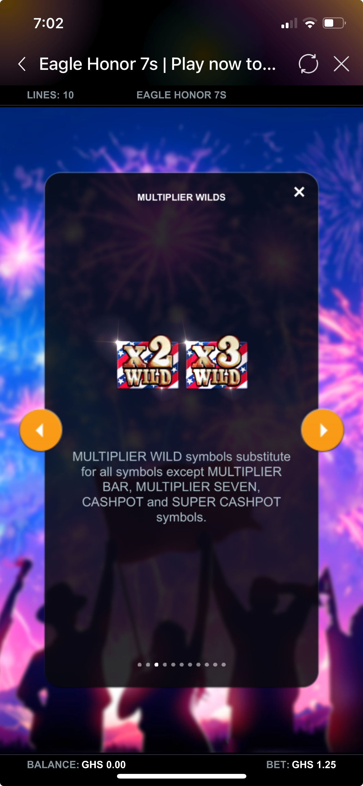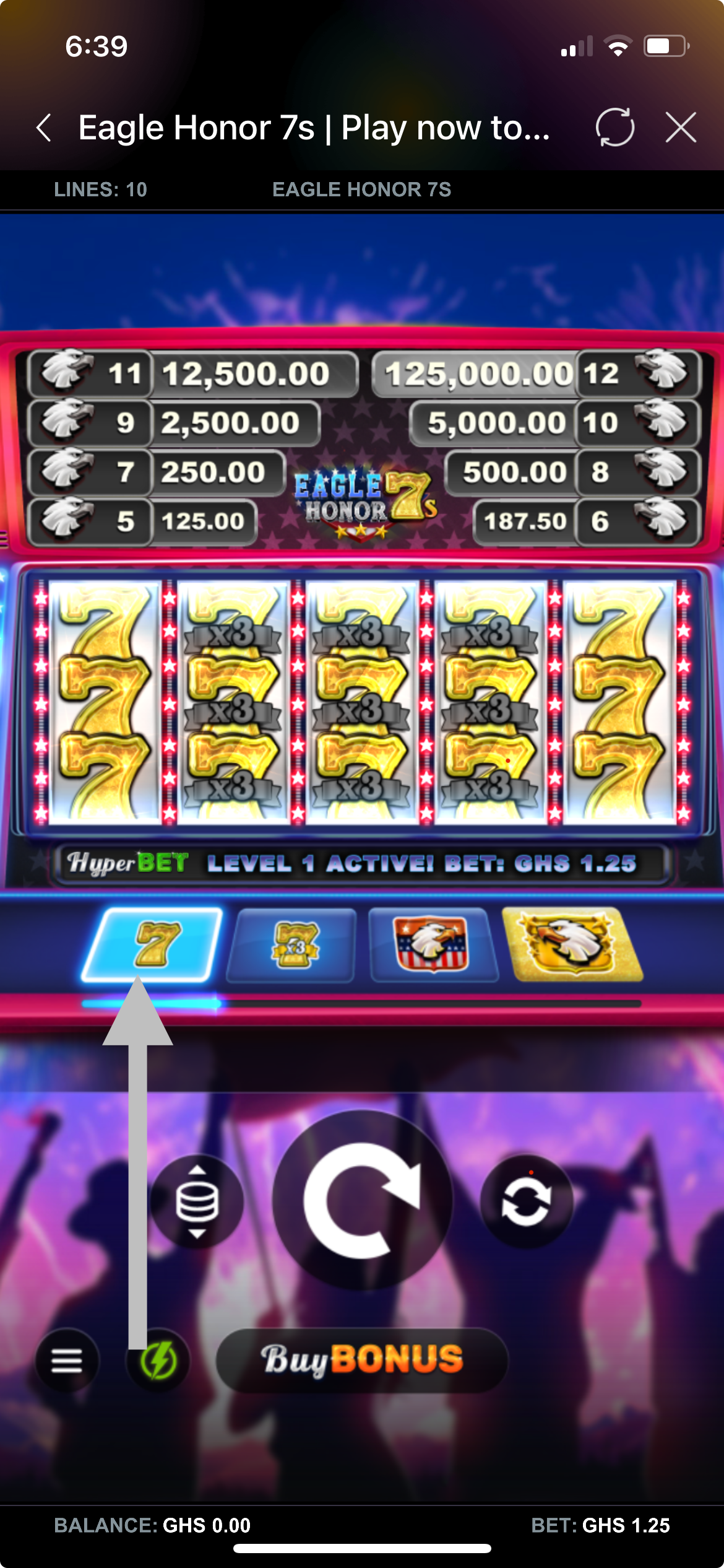 Eagle Honor 7s is a video slot game with 5 reels, 3 rows, and 10 paylines. The game is packed with exciting features like 4 HyperBet levels, Multiplier Wilds, Cashpot prizes, and Free Spins Bonuses. Each level unlocks more features and bigger win potential.