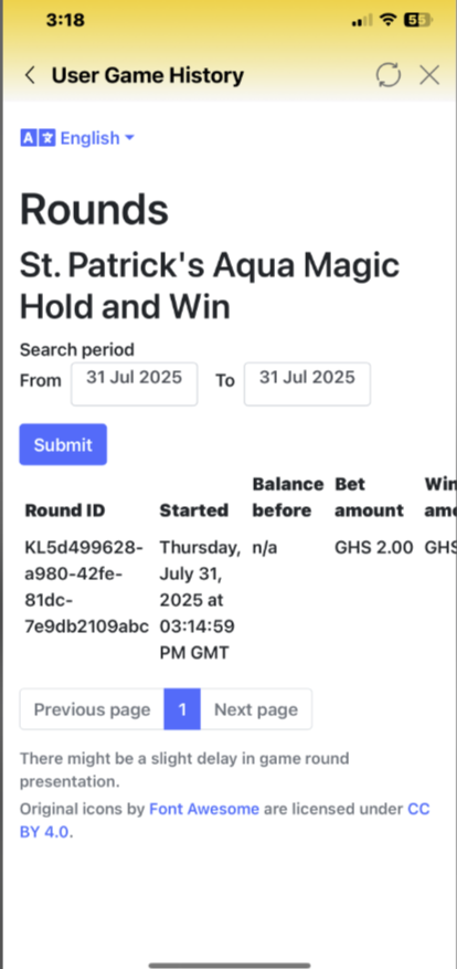 - View past rounds, including Round ID, Bet Amount, and Win Amount.