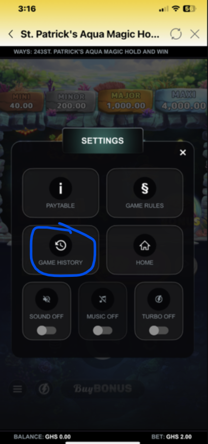 - Navigate to SETTINGS and select GAME HISTORY.