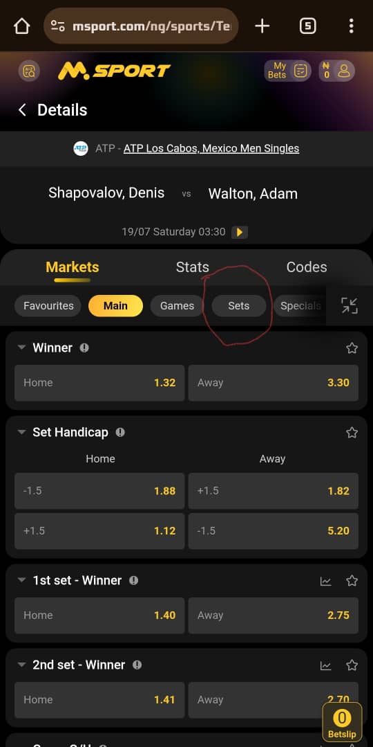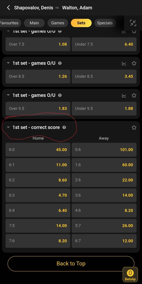 Scroll to 1st set correct score and make your selection as shown in the screenshot below