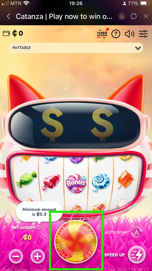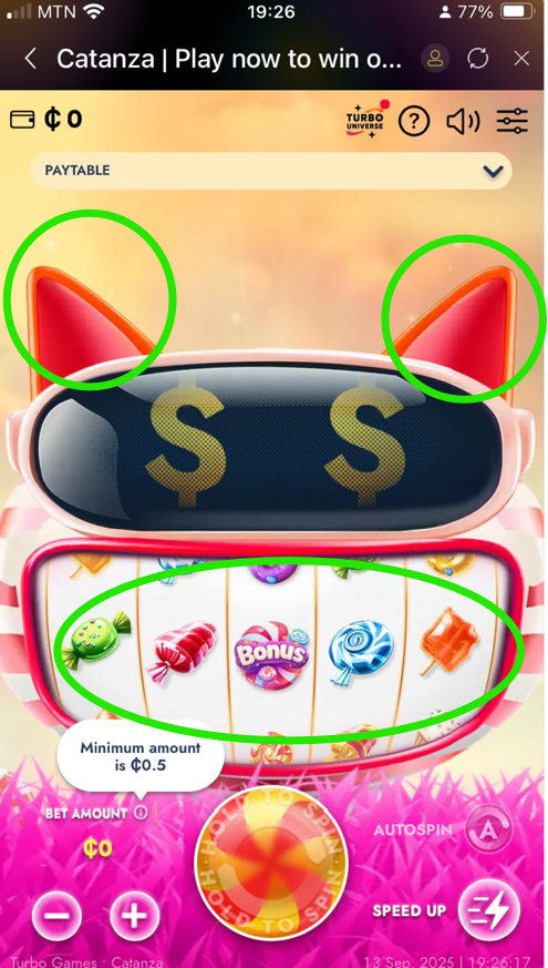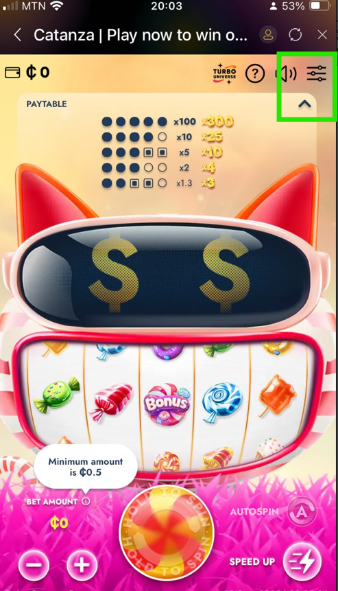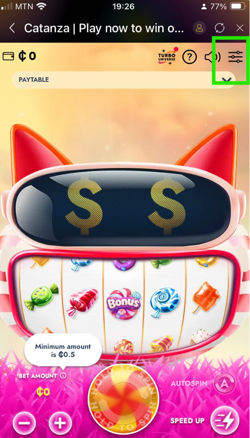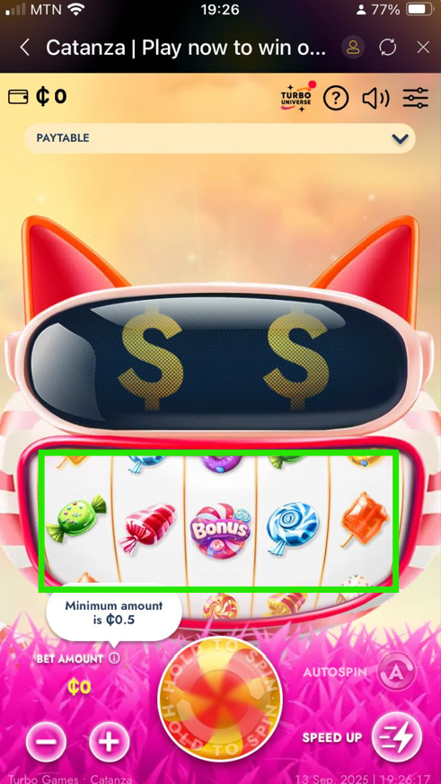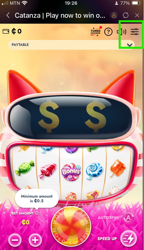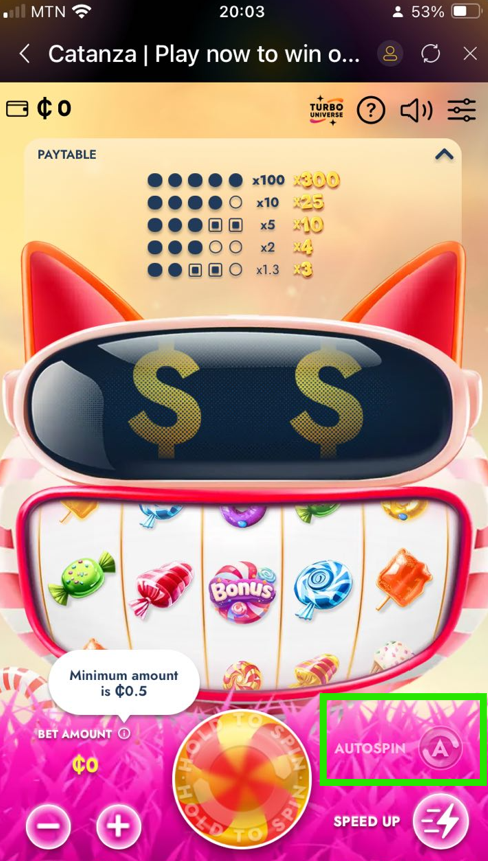 3. On the next page, Tap on GO! and you will see the Catanza game page with a smiling cat-like teeth machine slot showing some 5 candies , with some other features like your balance, sound , setting and a round spin reel.