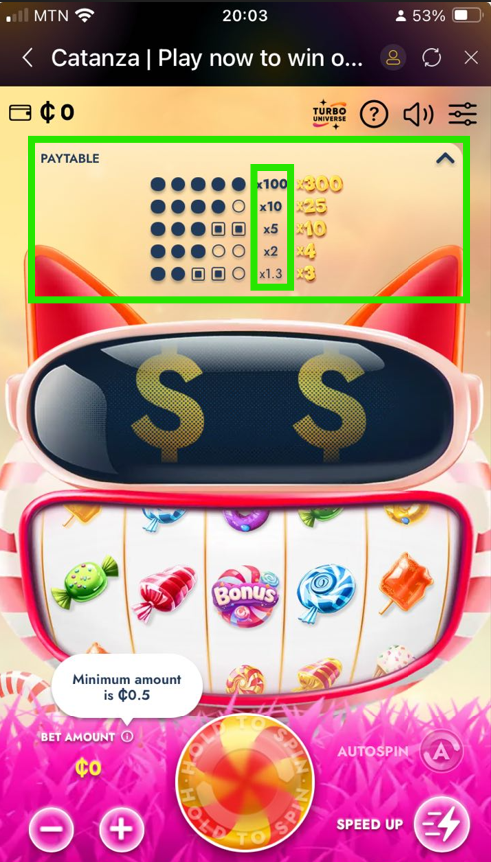 The Symbols and it's combination gives the guide on how you will be paid with your win. On the game page, you are given pay table. if you spin and your candies fall among any of these 5 symbols and it's combination, then your stake will be multiplied by that paytable odds to get your win amount.