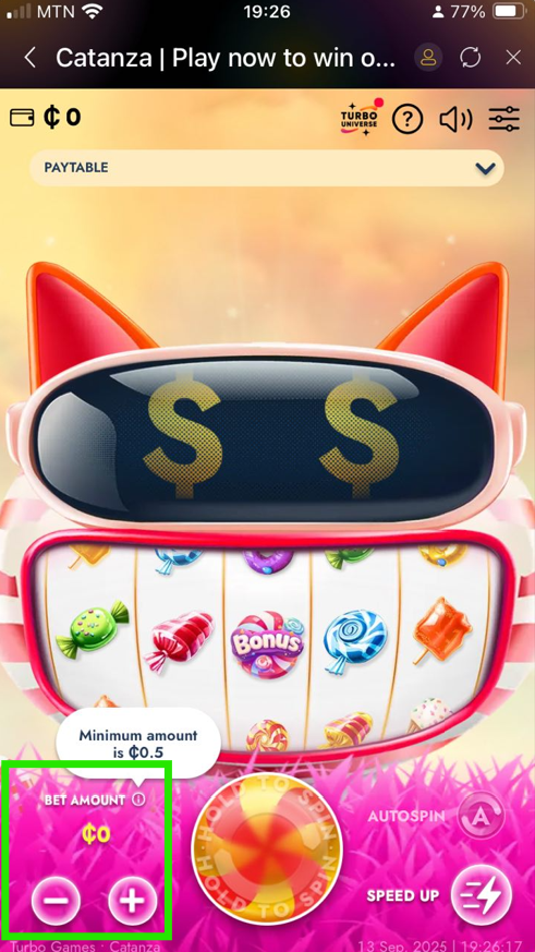 1. Enter your desired bet amount by tapping on the 0 cedis or Select your bet amount by adjusting it with the "+" and "-" buttons .
