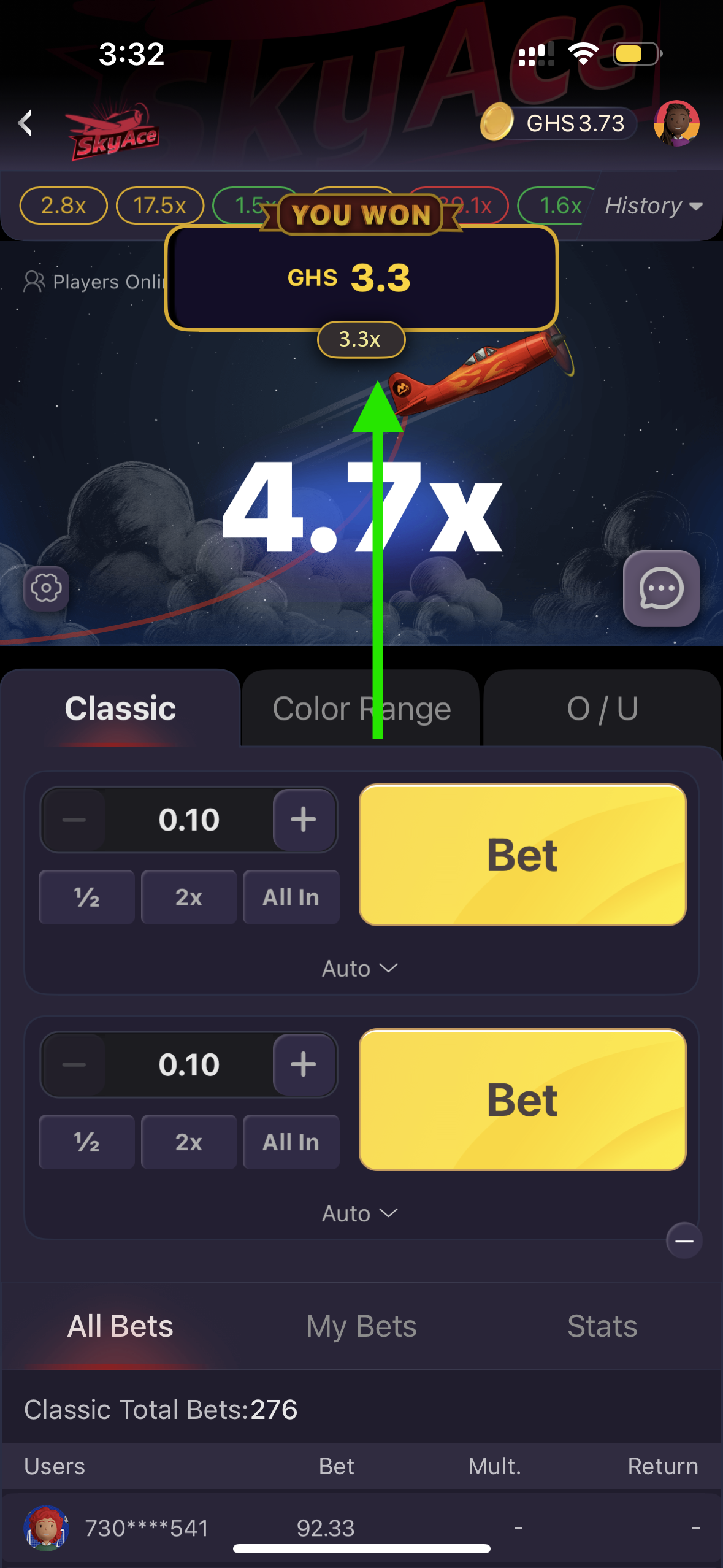 🎯 The multiplier you cashed out at (or missed if the plane flew away)
