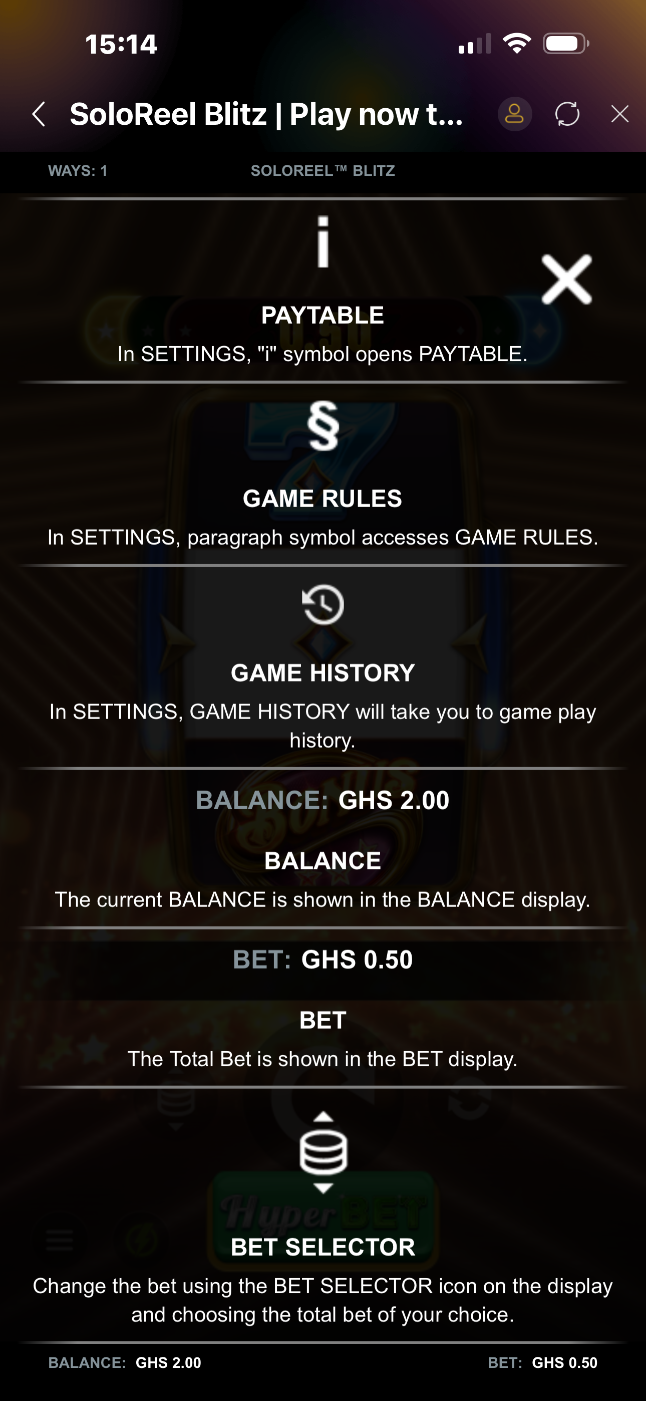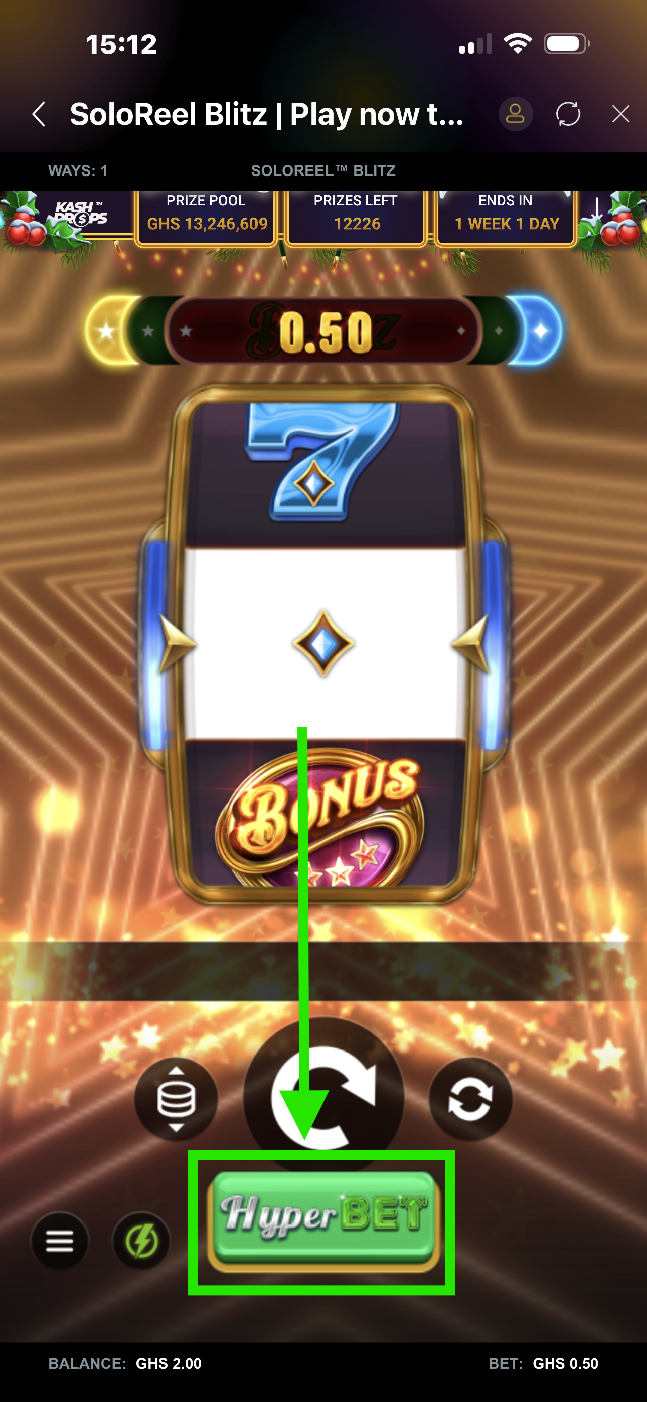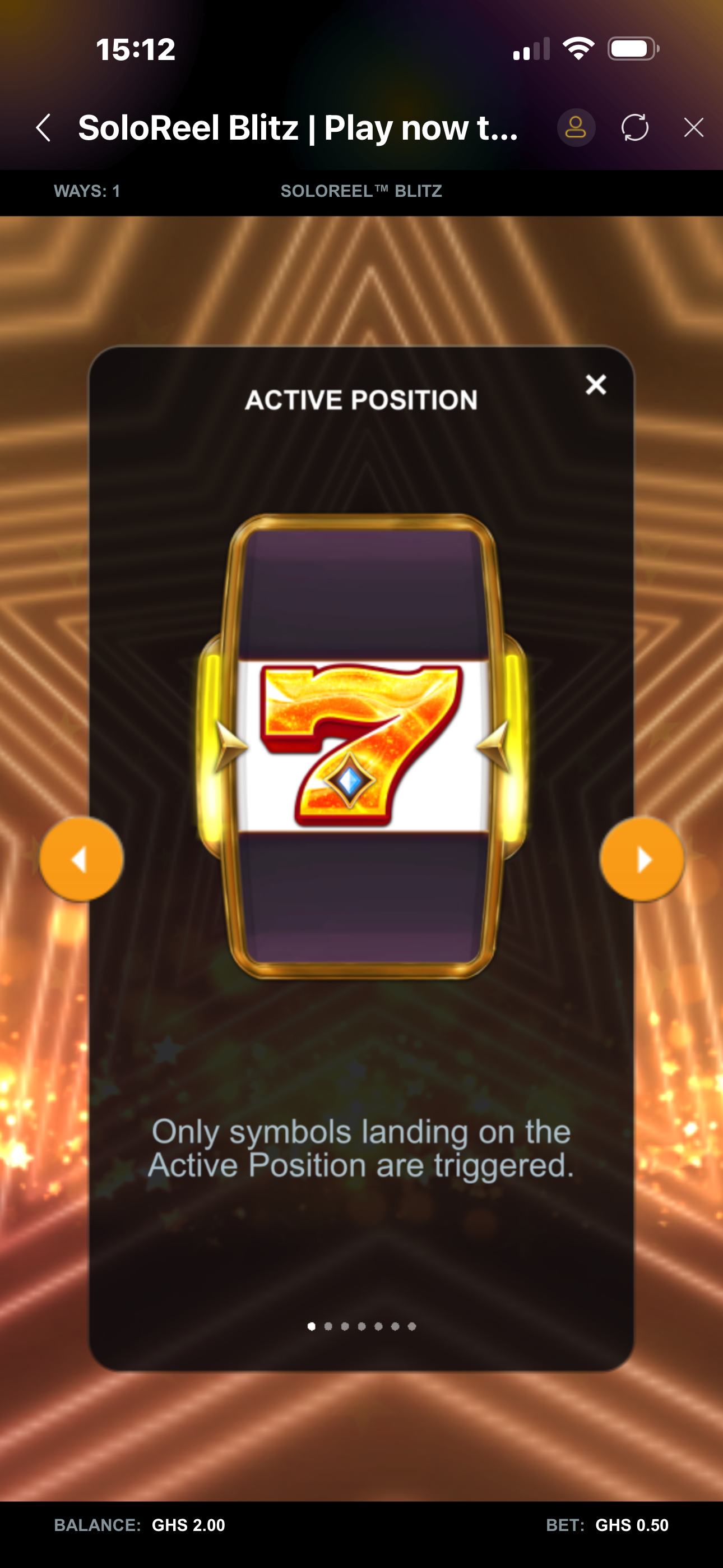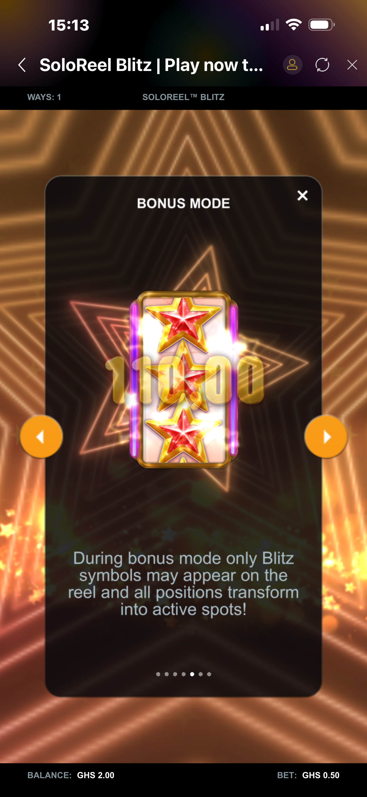 SoloReel Blitz is a 1-reel video slot game with 1 way, featuring Active Position, Blitz mode, Bonus Mode, and HyperBet.