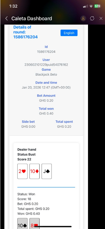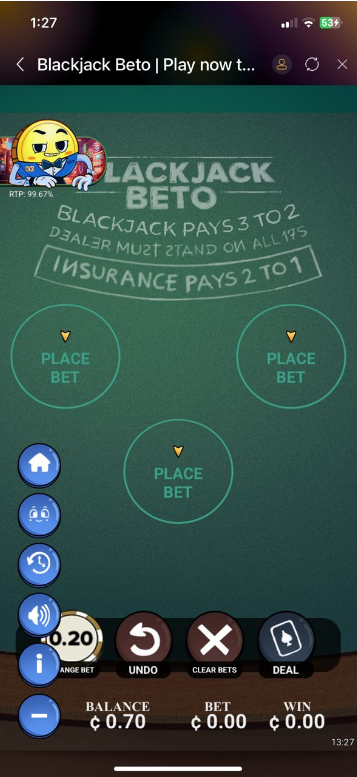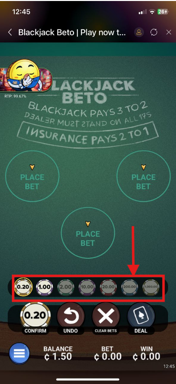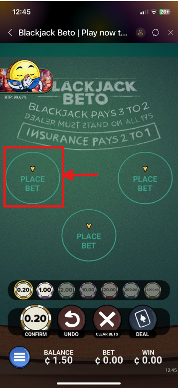 1. Place Your Bets: Choose your chip value using the arrow keys (Min: GH₵ 0.20, Max: GH₵ 1,000) and tap BET.