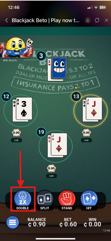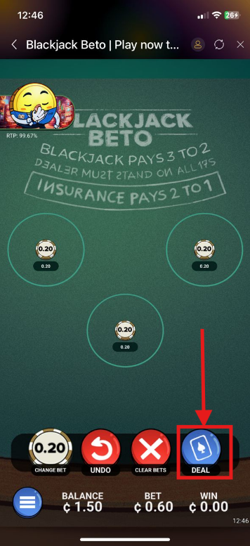 4. Tap DEAL to get two face-up cards and the dealer's one face-up and one face-down card.