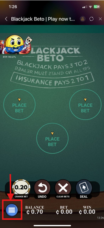 In Blackjack Beto, you can access the settings through the Menu (three lines) located in the top corner of the game screen. Here you can: