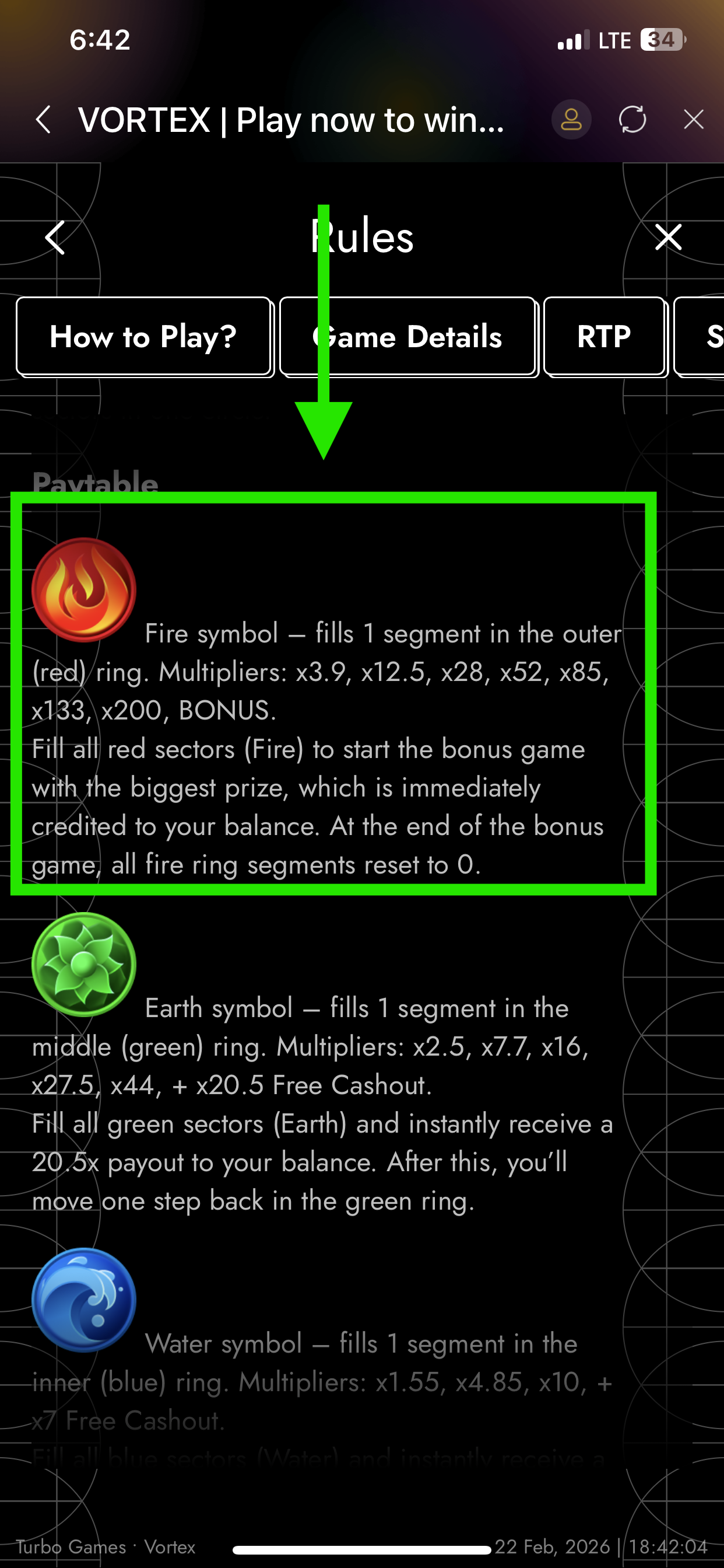 - The highest RTP value is achieved when cashing out on the first segment after landing any of the three symbol types (Fire, Earth, Water).