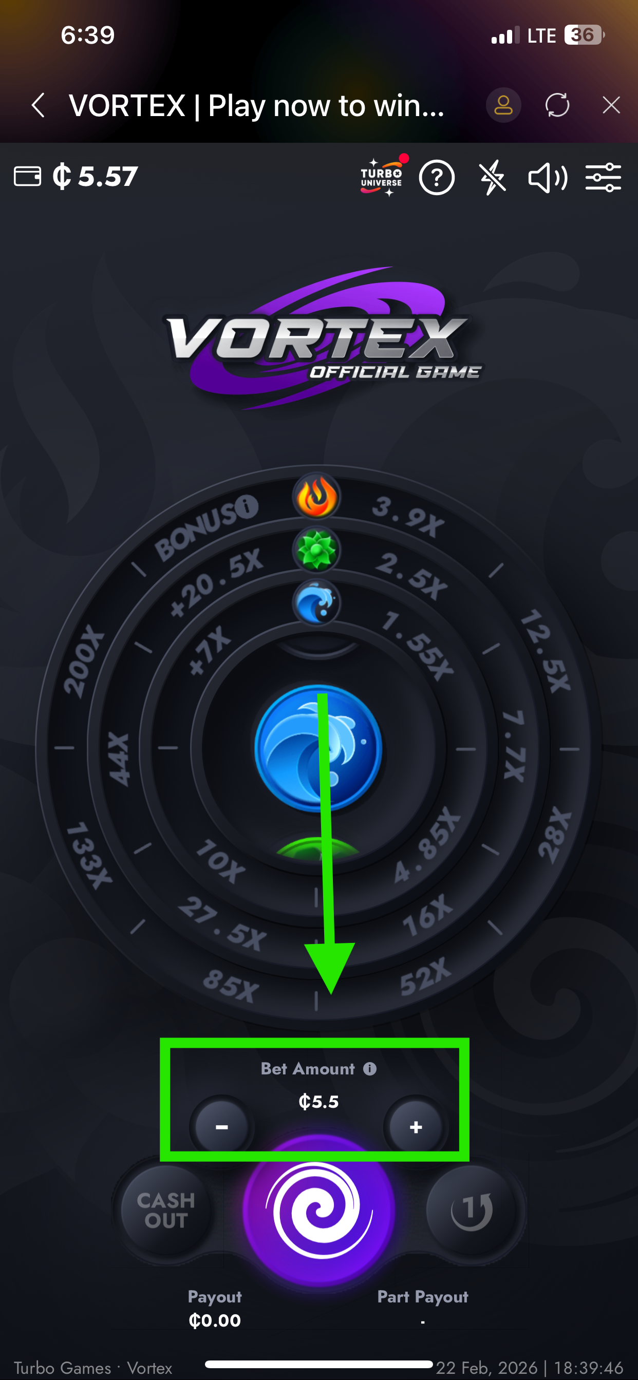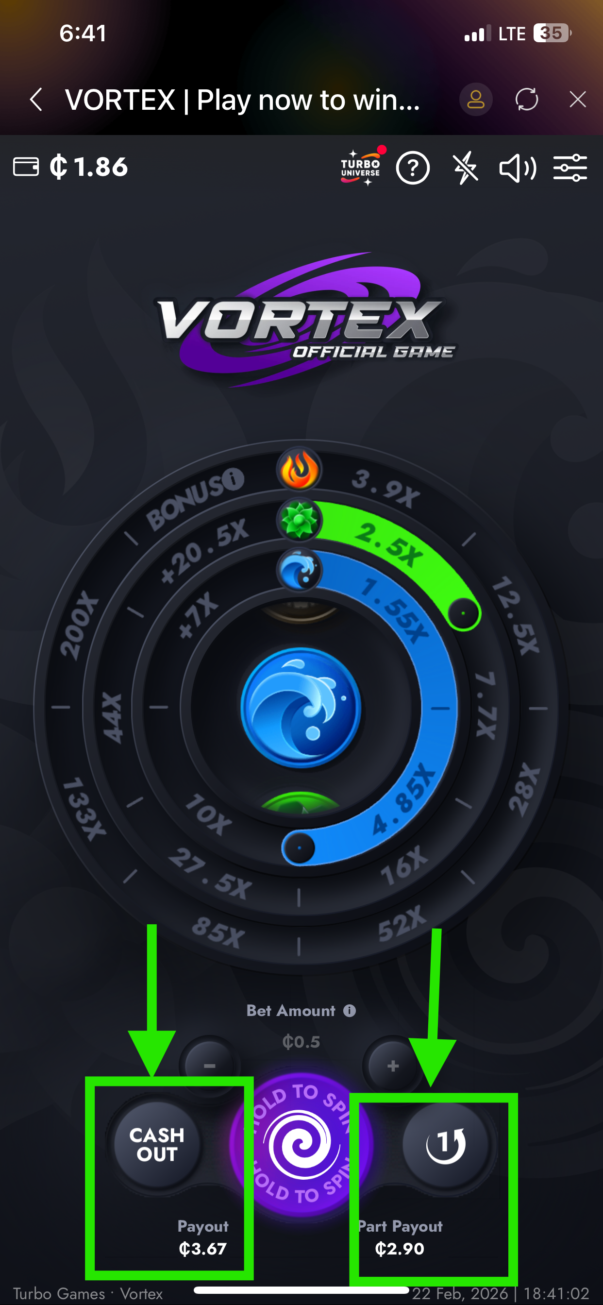 Part PayOut - Press "Part PayOut" to receive the difference between the last and the penultimate segments in each filled circle to your balance. "Part PayOut" is unavailable if only 1 sector is filled in any circle. To activate the "Part PayOut" button, fill at least 2 sectors in one circle.