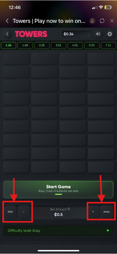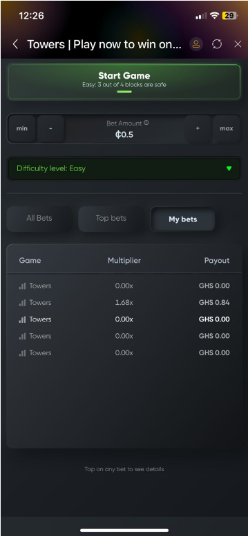 1. Choose your Bet: Choose your stake from GH₵ 0.50 minimum to GH₵ 1,000 maximum using the + or - buttons and click Start Game.