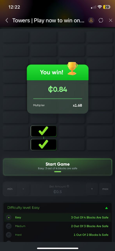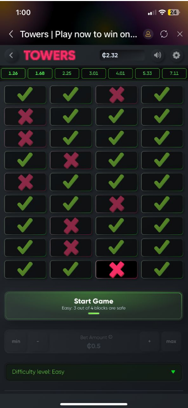 Towers by Turbo Games is a fast-paced online twist where players uncover "✅" while avoiding hidden "❌" signs. The goal is to reveal as many ✅ as possible without hitting a ❌ .