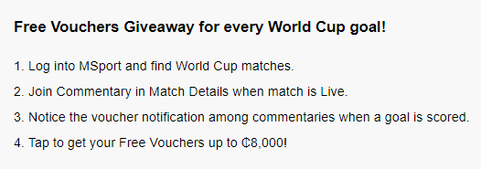 7. 2. To celebrate the FIFA World Cup Qatar 2022, MSport will distribute ₵5,000 free vouchers for each World Cup goal and total vouchers distributed in each match do not have a maximum limit!