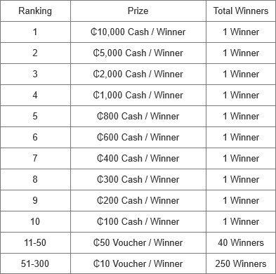 Answer: The customers will join the Ranking automatically and get Cash/Voucher prizes according to the accumulated points the customer has obtained.