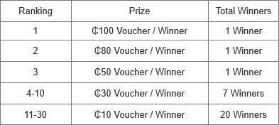 (2) The senior ranking is "King Ranking", which settles at 23:59:59 (UTC+0) on 31th December. Points accumulated during the entire promotion period will be counted. Customers with the same points will be ranked based on the time they reach the final points.